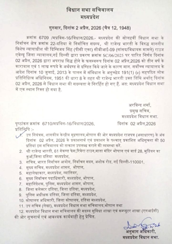 मध्य प्रदेश विधानसभा का फैसला: दतिया से कांग्रेस विधायक राजेंद्र भारती की सदस्यता हुई समाप्त