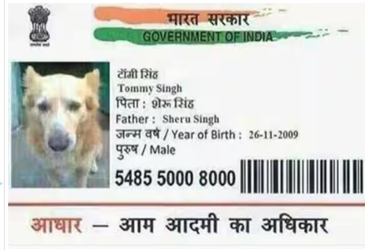 दरअसल, सोशल मीडिया पर एक आधार कार्ड वायरल हो रहा है, जिसमें डॉग का फोटो लगा हुआ है। नाम की जगह टॉमी जैसवाल लिखा हुआ है, जन्मतिथि 25 दिसंबर 2010 लिखा हुआ है। इन सबसे अलग बात जेंडर पहचान के रूप में हिंदी में कुत्ता और इंग्लिश में डॉग लिखा हुआ है, बाकायदा, आधार नंबर – 070001051580 भी लिखा हुआ है।वहीं आधार कार्ड के पिछले हिस्से में पता भी लिखा हुआ है। इसमें लिखा है कि पालनकर्ता कैलाश जैसवाल, वार्ड नंबर 01, सिमरिया ताल, डबरा, ग्वालियर, मध्य प्रदेश (475110)।