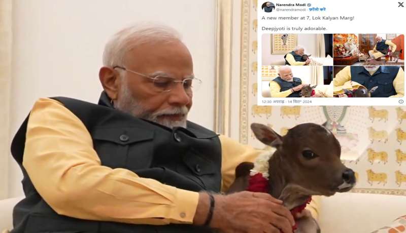 पीएम मोदी सोशल मीडिया पर काफी एक्टिव रहते हैं। वह जो भी करते हैं, वो तेजी से उनके फॉलोअर्स समेत देशभर में फैल जाता है। उन्होंने अपने सोशल मीडिया हैंडल "X" पर पोस्ट कर ये जानकारी दी है कि उनके घर में एक नन्हा मेहमान आया है और इस मेहमान का नामकरण भी किया गया है। पीएम मोदी ने कहा, 'हमारे शास्त्रों में कहा गया है- गाव: सर्वसुख प्रदा:। लोक कल्याण मार्ग पर प्रधानमंत्री आवास परिवार में एक नए सदस्य का शुभ आगमन हुआ है। प्रधानमंत्री आवास में प्रिय गौ माता ने एक नव वत्सा को जन्म दिया है, जिसके मस्तक पर ज्योति का चिह्न है। इसलिए, मैंने इसका नाम 'दीपज्योति' रखा है।'