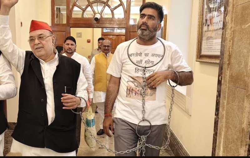 सपा विधायक हाथ पैरों में जंजीर पहनकर प्रदर्शन किया