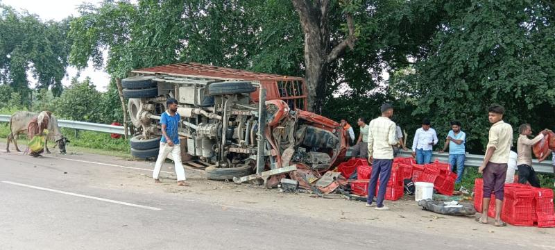महाराजपुर। रविवार तड़के लगभग 4 बजे सागर से सब्जी लादकर कबरई (उत्तरप्रदेश) जा रहा आयशर ट्रक भीषण हादसे का शिकार हो गया। बताया गया कि गांव के पास तालाब किनारे स्थित बिहारी जू मंदिर के समीप आगे चल रहा एक ट्रक आवारा पशुओं को बचाते हुए धीमी गति से चल रहा था। इसी दौरान पीछे से तेज रफ्तार ट्रक (यूपी 78 एफएन 8550) ने उसमें जोरदार टक्कर मार दी।