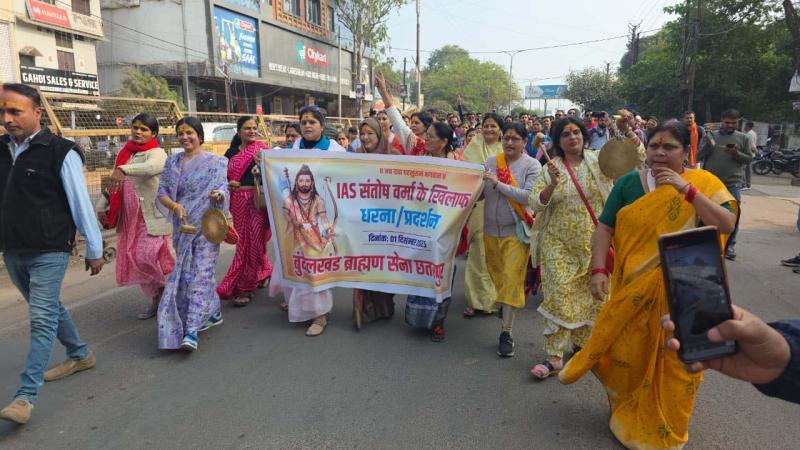 दोपहर में सैकड़ों की संख्या में ब्राह्मण समाज और करणी सेना के पदाधिकारी-कार्यकर्ता जिला मुख्यालय पर एकत्रित हुए, जिनके द्वारा रैली निकालकर जोरदार प्रदर्शन किया गया। इतना ही नहीं एक स्थान पर आईएएस संतोष वर्मा का पुतला भी जलाया गया। प्रदर्शन के उपरांत ब्राह्मण समाज और करणी सेना सहित अन्य सामाजिक संगठनों के सदस्यों ने पुलिस अधीक्षक कार्यालय पहुँचकर प्रधानमंत्री के नाम संबोधित एक आवेदन सौंपा, जिसमें उल्लेख है कि आईएएस संतोष वर्मा के बयान ने न सिर्फ समाज में वैमनस्यता फैलाई है, बल्कि सार्वजनिक पद पर बैठे व्यक्ति के आचरण की मर्यादा का भी उल्लंघन किया है, ऐसे में उनके खिलाफ तत्काल प्राथमिकी (एफ.आई.आर.) दर्ज कर कठोर कानूनी कार्रवाई होनी चाहिए। इस मौके पर ब्राह्मण समाज की ओर से रविश मिश्रा, शैलेन्द्र कौशिक, अधिवक्ता रवि पाण्डेय, करणी सेना के पदाधिकारी शिवप्रताप सिंह सहित सैकड़ों लोग मौके पर मौजूद रहे।